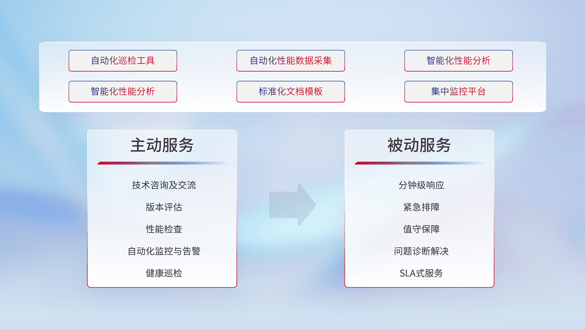 智能化工具和标准化文档,,,,保障服务质量,,,提供主动服务(包含技术咨询、、、版本评估、、、性能检查、、自动化监控与告警、、健康巡检)和被动服务包含(分钟级响应、、紧急排障、、、值守保障、、问题诊断解决、、SLA服务)。。